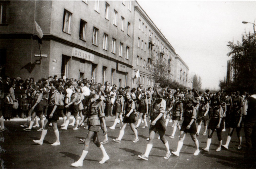 Pochód pierwszomajowy, kolumna harcerzy, Ursus, pl. 1000-lecia - lata 70-te XX w.
