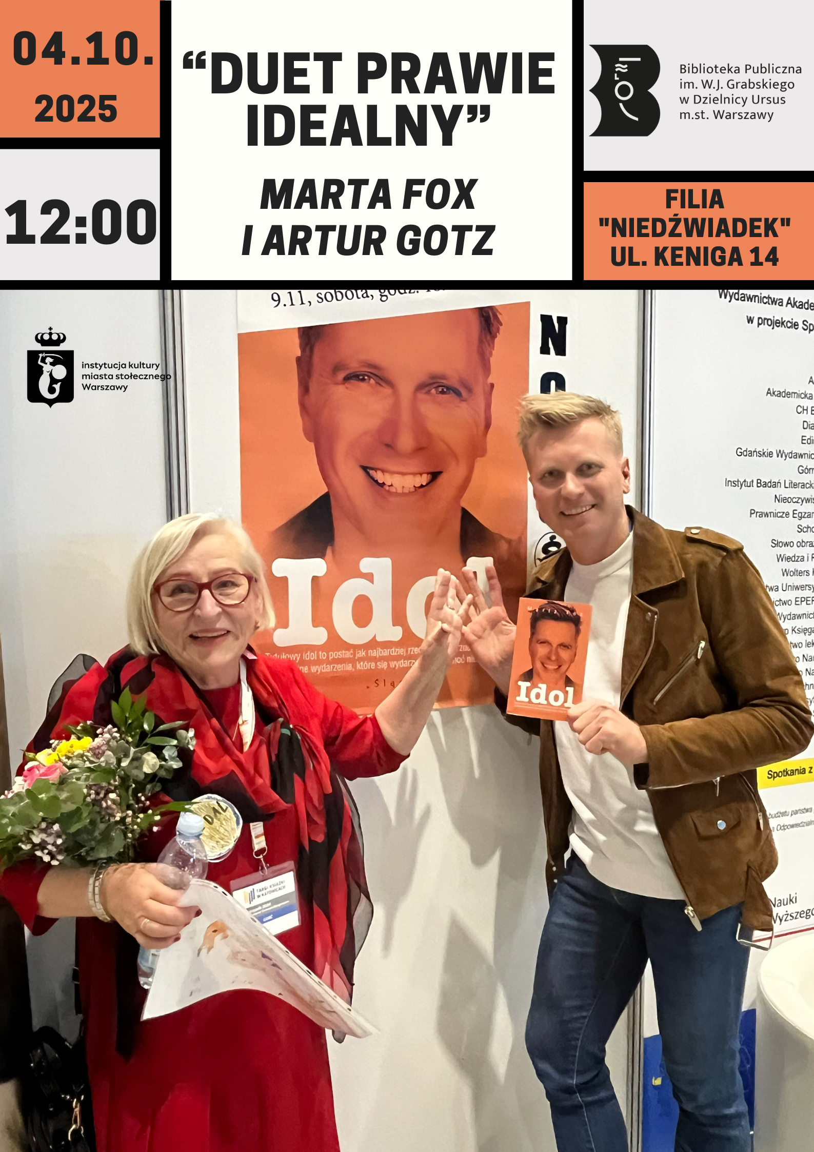 Serdecznie zapraszamy na spotkanie literacko-muzyczne z udziałem Marty Fox, autorki powieści pt. Idol, oraz bohatera tej powieści, Artura Gotza, aktora i wokalisty.