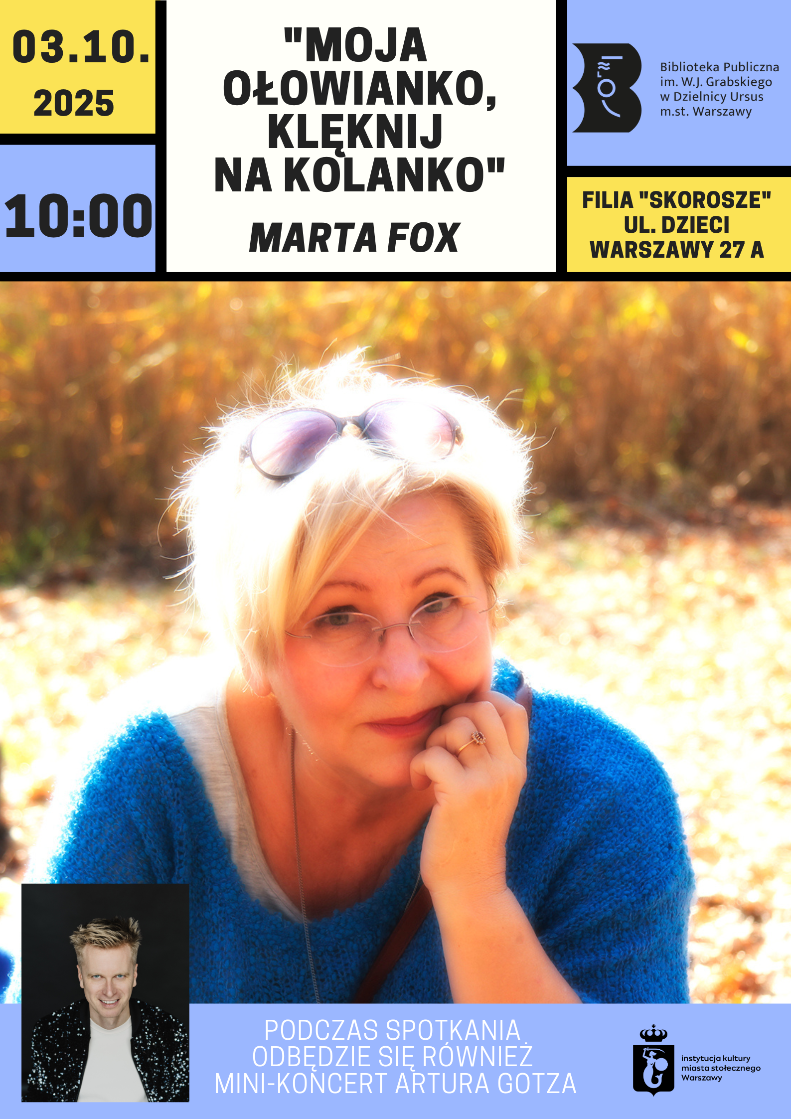Podczas spotkania odbędzie się również mini-koncert Artura Gotza, wokalisty i aktora, bohatera bestsellerowej powieści Marty Fox pod tytułem „Idol”.
