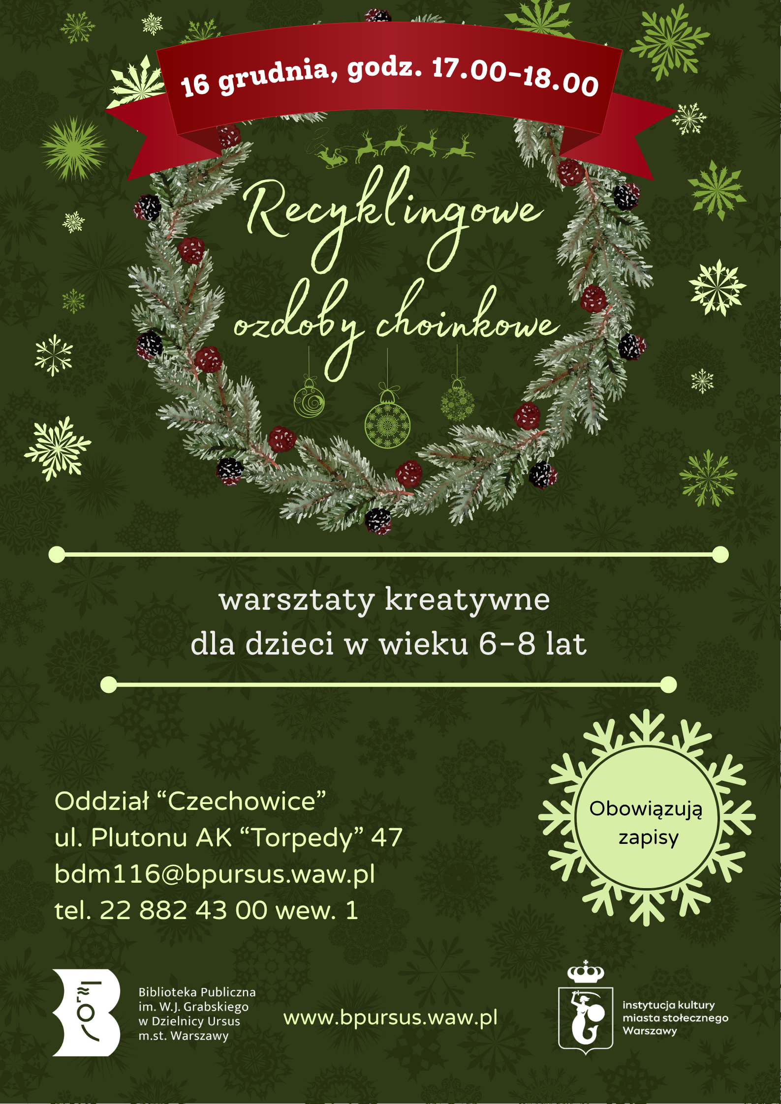 Recyklingowe ozdoby choinkowe – warsztaty kreatywne dla dzieci w wieku 6-8 lat. Obowiązują zapisy.