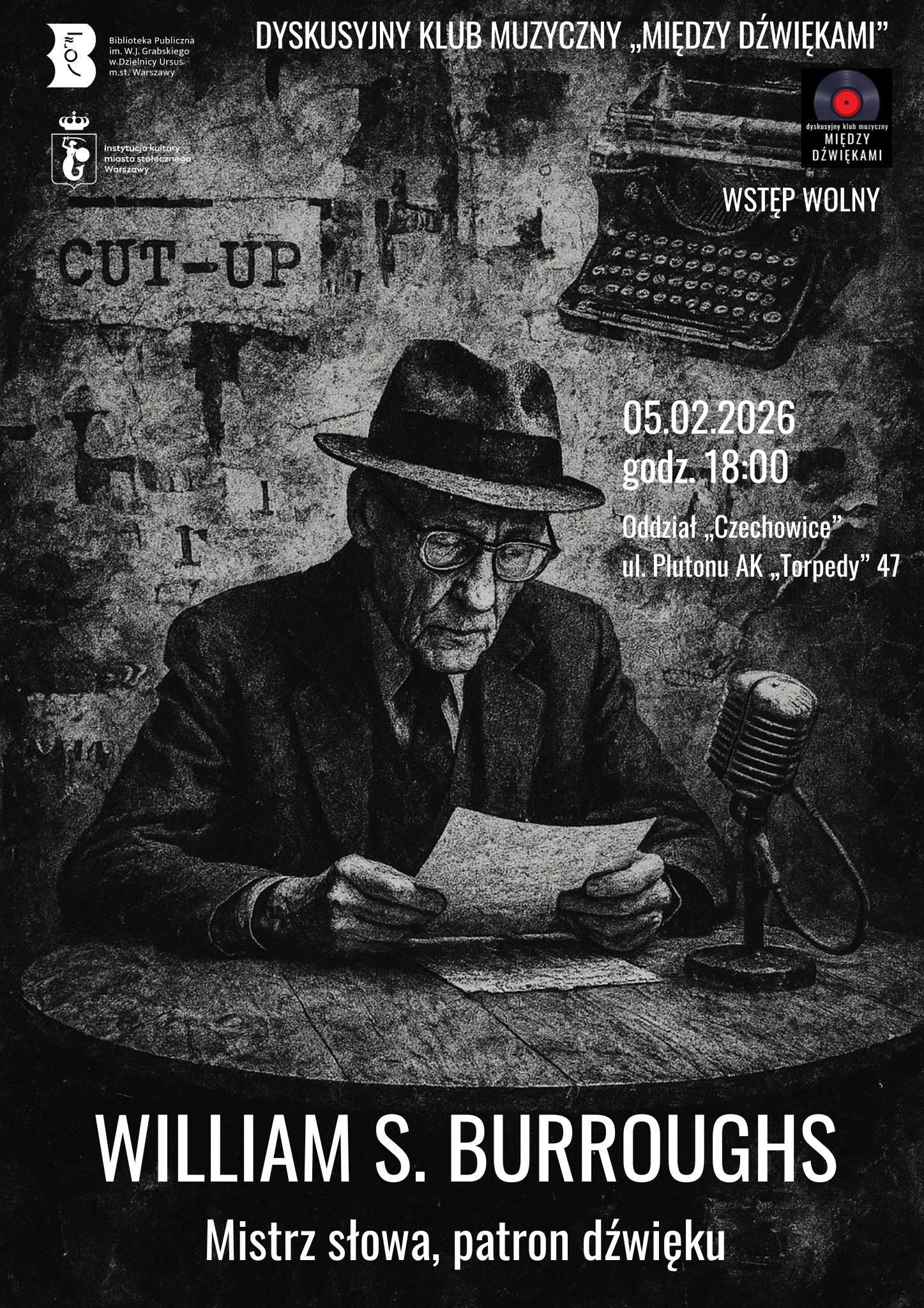 Podczas spotkania przyjrzymy się jego kluczowym utworom („Nagi lunch”, „Nova Express”, „The Soft Machine”) oraz ideom kontroli, uzależnienia, paranoi i rozpadu tożsamości, które stały się paliwem dla artystów muzycznych kolejnych dekad. Burroughs był nie tylko inspiracją – był realnie obecny w muzyce: nagrywał spoken word, współpracował z muzykami, pojawiał się na płytach i scenach.