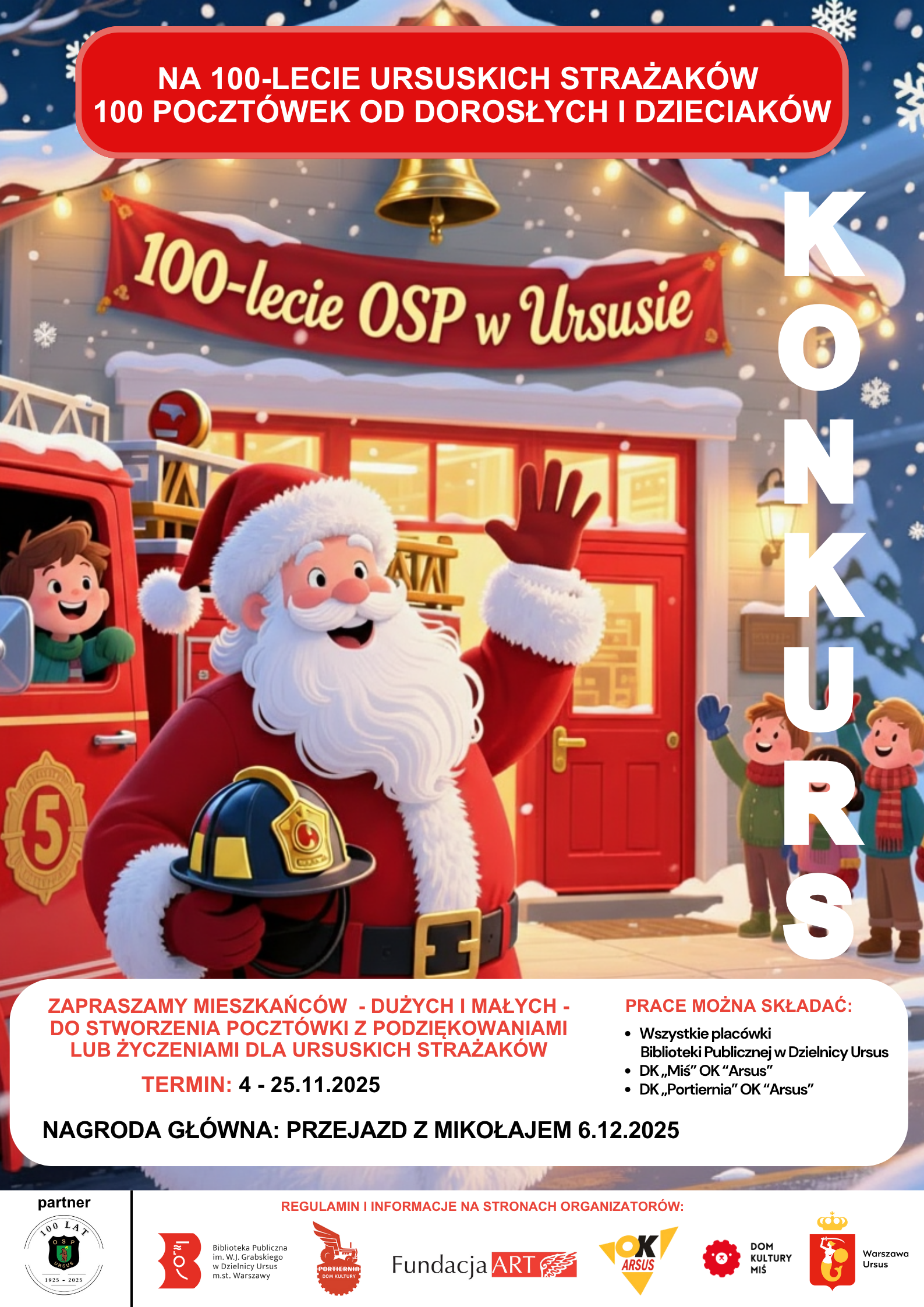 W tym roku 6.12.2025 Święty Mikołaj przyjeżdża do Ursusa z wyjątkową misją! Z okazji 100-lecia Ochotniczej Straży Pożarnej w Ursusie zapraszamy mieszkańców – dużych i małych – do udziału w niezwykłym konkursie mikołajkowym pt. „Na 100-lecie ursuskich strażaków – 100 pocztówek od dorosłych i dzieciaków”.