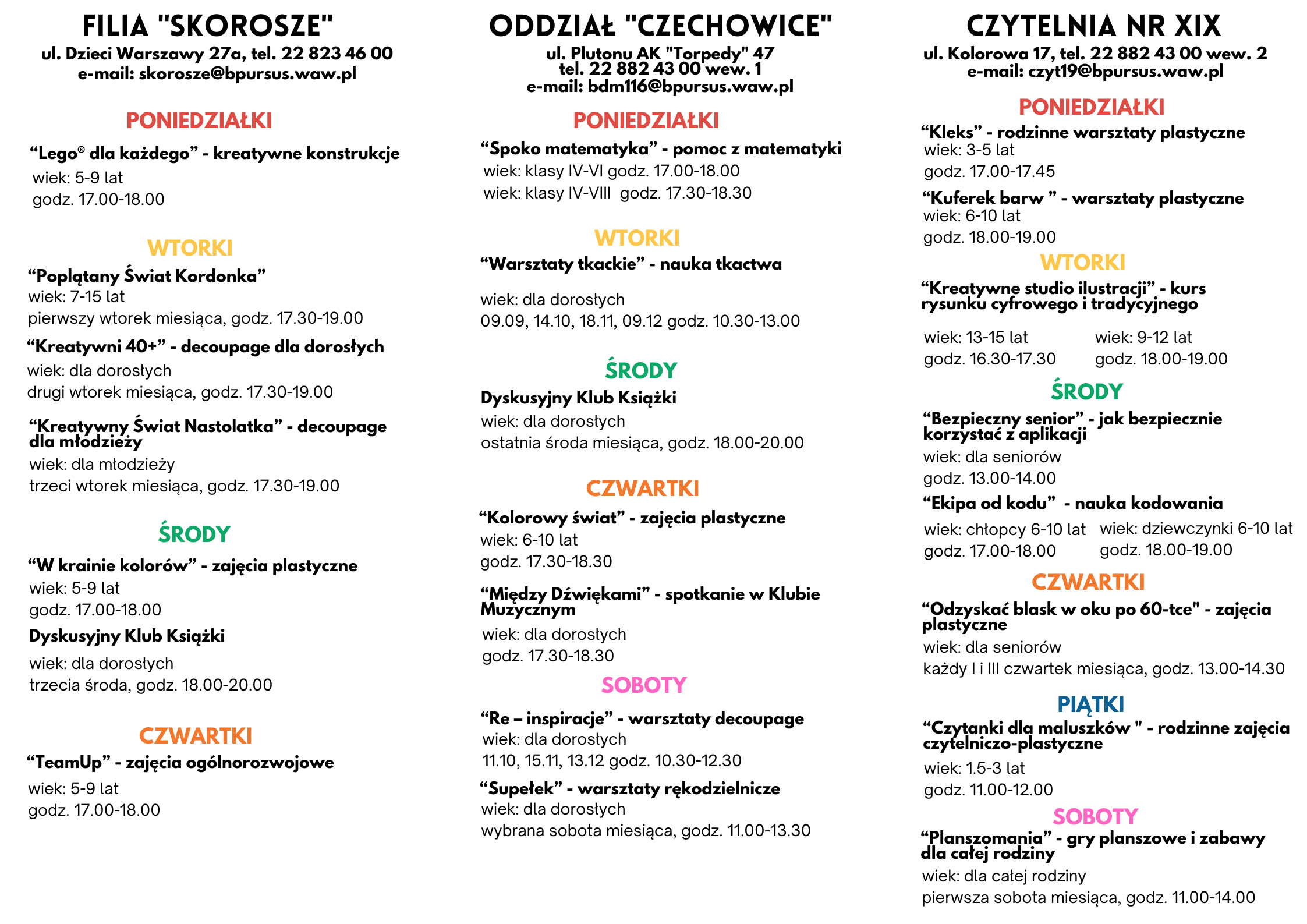 17, 24 września, godz. 17.00-18.00 – „W krainie kolorów” – zajęcia plastyczne wykorzystujące różnorodne materiały. Dla dzieci w wieku 5-9 lat. Obowiązują zapisy.